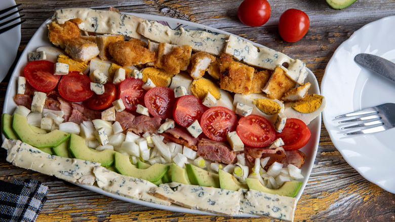 This rotisserie chicken sandwich borrows elements from the classic Cobb salad for similarly vibrant flavors without the fork. Even eschewing a few of the Cobb classics, namely the greens and hard boiled eggs, you're still piling a lot on, so slicing everything thin is key. Sprinkle blue cheese crumbles over the bottom half of a sturdy baguette before layering the chicken, tomato, and avocado. Chopped bacon is also more manageable than crispy strips in this case, and a coat of mayo on the top half of the baguette will help it adhere.
