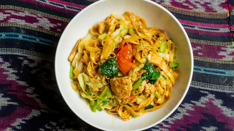 Also known as drunken noodles, pad kee mao has plenty of garlic, which adds fragrant flavor, but also a bit of a kick at times. They're also loaded with Thai basil, which is different from other varieties in flavor and size. Add your choice of protein, such as chicken or beef. This noodle dish isn't as soupy as Thai curries and will need a fork rather than a spoon.