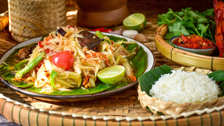 If you want something refreshing for lunch, som tum, also known as green papaya salad, is a top choice. This salad is full of fresh flavor, making it a great choice for a lighter meal that won't fill you up too much. As the name suggests, shredded green papaya makes up the base, but other vegetables fill things out. Tomatoes and long beans are plentiful, but it's the lime-based dressing that really brings the fresh, bright flavor.