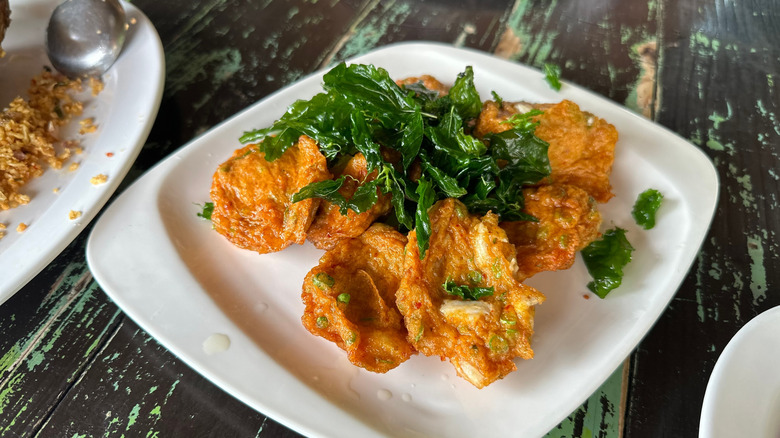 These fish cakes are crispy on the outside but have plenty of salty, umami flavor. They typically come on a sharable plate and make a fantastic appetizer for a larger meal. Some restaurants like to add a little bit of Thai basil garnish while others really load them up. The fish cakes get a touch of spices before being fried, which incorporates these flavors well into every bite. They're not a light appetizer, like some of the soups or salads on our list, but instead bring a heartier start to your lunch or dinner.