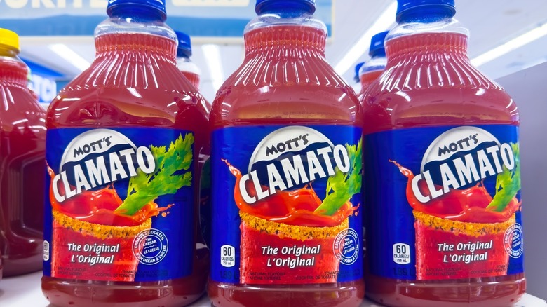Made with clamato juice, this swap might not be lost on you if you're familiar with beer cocktails such as the classic clamato michelada. But for the uninitiated, you can think of this juice essentially as tomato juice mixed with clam juice. We know — that's not a very convincing sales pitch for the beverage, but the briny taste of the clam flavor adds a layer of complexity to the cocktail not achieved with regular tomato juice. It also helps that the typical store-bought clamato juice tends to be thinner than tomato juice, making your bloody Caesar less viscous and soup-like compared to a bloody mary.