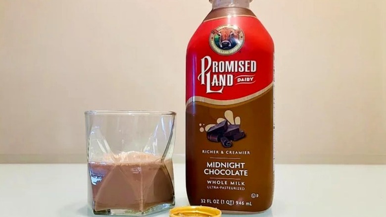 According to Chowhound's taste-tested ranking of 16 store-bought chocolate milk brands, Promised Land Midnight Chocolate Whole Milk was the clear winner. It had a pleasant mouthfeel for its creamy consistency, leaving behind traces of itself in the glass. This sort of smoothness is precisely what chocolate milk should have. It had a premium chocolate flavor that blew its competition out of the water (or milk, rather). "Promised Land Midnight Chocolate Whole Milk is by far the best brand on the market," wrote our taste tester.