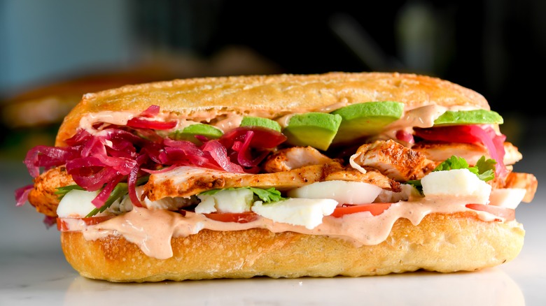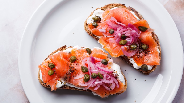 You can also add pickled onions to lighter breakfast sandwiches, like one stuffed with lox, capers, and dill. While this seafood-forward breakfast sandwich typically relies on fresh, thinly-sliced red onions for a punch of flavor, using pickled onions creates a more restrained taste that lets the natural brininess of the fish shine. You can also pile the onions on avocado toast for a bit of crunch — alongside other veggies like sprouts, thinly sliced cucumbers, or even a poached egg.