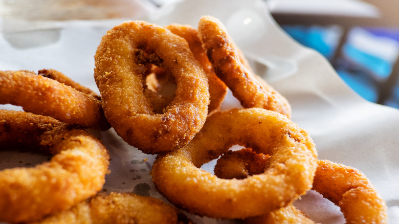The pungent vinegar flavor will come through strong and help cut through the greasiness of the onion rings. You can pair them with any sauce that you would normally dip your onion rings into — whether that's cocktail sauce, ketchup, or a souped-up mayo.