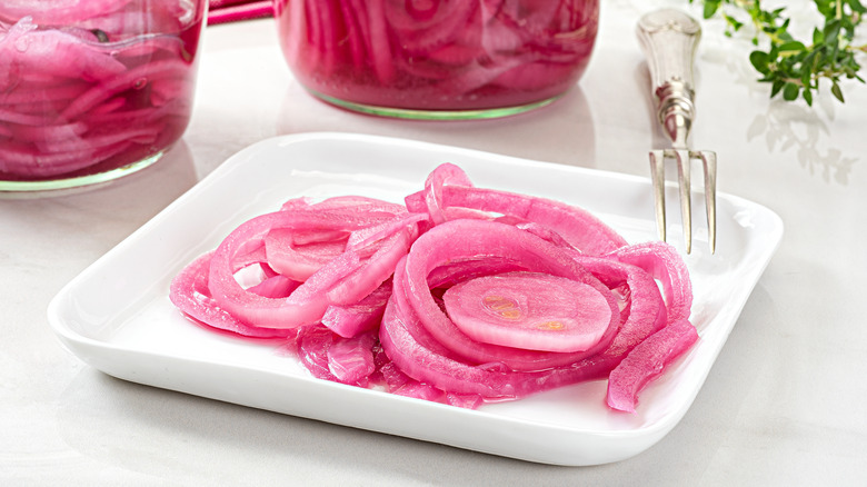 How should you put this unique condiment to good use? Luckily for you, we've curated a list of some of the best and tastiest ways to use pickled onions to enhance your favorite recipes. While red onions are the go-to onion for pickling — and a lion's share of these ideas keep their sharp, peppery undertones in mind — you can also pickle white, yellow, or sweet onions and use them for many of these applications as well.