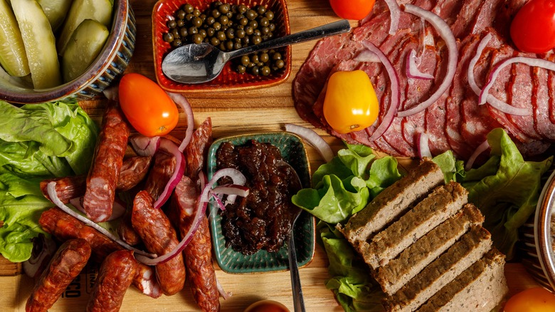 If you're planning on adding pickled onions to your charcuterie board, there are some smart pairings that you may want to consider. Crisp cucumbers and tomatoes are the perfect crunchy complements to pickled red onions and rich cheeses, like aged cheddar, goat cheese, and Gruyére. Fatty meats, including pâté and prosciutto, are also worthy pairings for the piquant pickled allium.