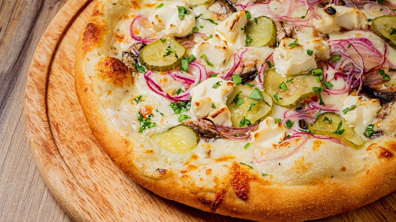 If you want the best crunch from your onions, you're going to want to add them to the pizza after it's finished cooking rather than before you put it in the oven. It also helps to chop up the alliums finely. This allows you to get a little bit in every single bite. Try pairing the pickled onions with your favorite pizza toppings, like seasoned chicken or pork, feta, olives, or garlic.