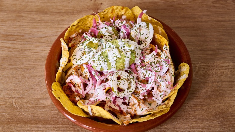 Nachos are a crowd-pleaser, especially when they're adorned with a 50/50 topping-to-chip ratio. A squirt of lime juice, salsa, or guacamole can help lighten up the mouthfeel — but these don't hold a candle to pickled onions.