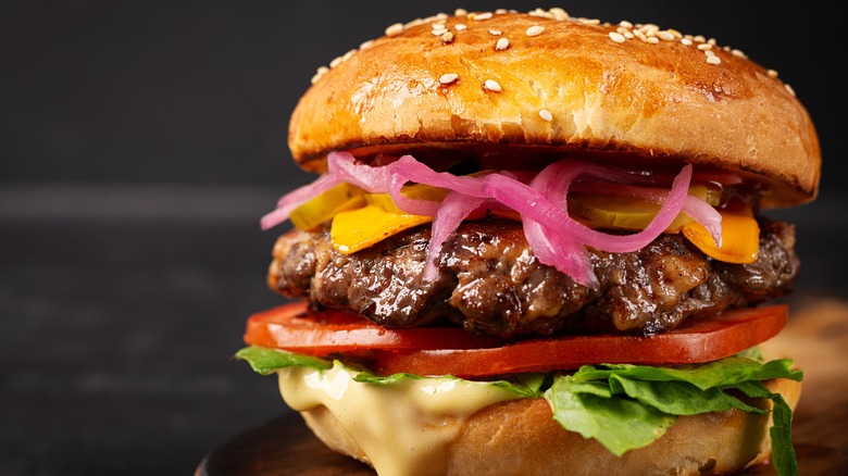 Burgers are a well-designed, portable, and filling meal tucked in a bun. But all too often, these classic American sandwiches tend to be especially rich and heavy. Not only do you have the gristly and greasy patty, but they're also often adorned with gooey melted cheese and sauces galore. Pickled onions are a great food to add to your burger because they can cut through that richness and bring balance to your bite, along with a unique crunch. Though you'll still get an oniony flavor, it's nothing near the sharp, tear-inducing flavor of freshly sliced red or white onions.