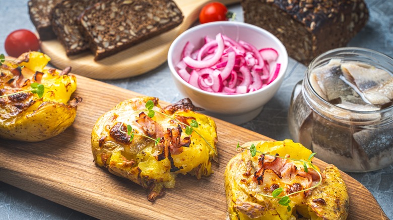 Baked potatoes are an incredibly versatile side dish — seeing as how you can either dress them up or down based on the occasion. If you're looking to put your spuds in their Sunday best, consider topping them with a generous portion of pickled onions. Typically, baked potato toppings are rich and fatty — think shredded cheese, butter, and sour cream — so they could use something to slice right through that one-dimensional flavor. That's where the pickled red onions come in.