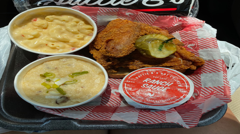 The Mini Chicken Sammies topped with honey butter are worth a visit or two alone. In fact, everything that comes between one of the fluffy Rise & Shine Biscuits is incredible. You can get your chicken sammie topped with bacon, egg, and cheese for a true breakfast experience. You can also order the buttery biscuits on their own and just eat them buttered or with jam. We'd also be remiss not to mention the Chicken Mac Bowl, which features gouda mac and cheese with the signature hot chicken mixed in and topped with honey barbecue sauce.