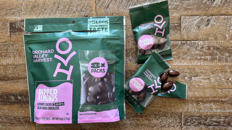 Orchard Valley Harvest was the only brand I sampled for this ranking that offered individually packaged nuts. While this format wouldn't be ideal for adding to a charcuterie board or eating in massive quantities, it does allow you to pack the nuts in your bag or eat them as an on-the-go snack in between errands. The packaging method also keeps the nuts and the chocolate fresh, which was one area that Orchard Valley Harvest really excelled at. You could tell that these treats were fresh, which was not the case with some of the lower-ranked brands on this list.