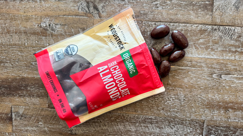 I found Woodstock's organic dark chocolate almonds in the natural foods section of the grocery store. Usually I avoid this aisle because I can't justify paying more for a product just because it's certified organic. But these almonds were a cheap find — or should I say, they weren't as ridiculously overpriced as everything around them.