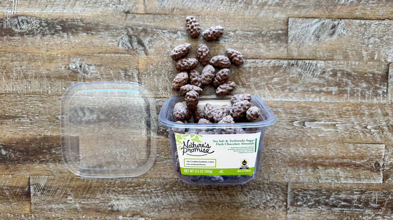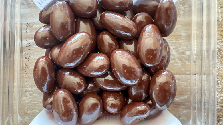Like the Aldi chocolate-covered almonds, these nuts had a beautiful chocolate coating that was shiny and attractive. They were also comparable in size to other top-ranked brands on this list, thanks to their generous chocolate coating. But it wasn't the chocolate coating that took me by surprise. Rather, the first thing that I noticed was the freshness and crispiness of the nuts inside of that coating. The almond audibly snapped when I bit into it and exuded freshness from start to finish. The chocolate coating around it was rich and flavorful, though it was slightly too sweet — and too thick — for my liking. Although I think it's important for these nuts to boast some sort of chocolate coating, it's easy to get distracted by the sugar and richness of the chocolate and forget about the nut underneath — which is precisely what happened with this brand.