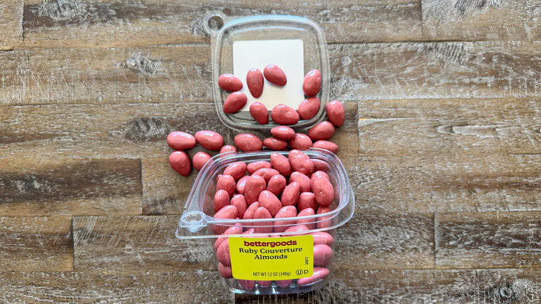 These nuts are adorned with an attractive, pink chocolate coating. If you were to try to guess what they were on a charcuterie board, I think your mind would go more toward yogurt-covered almonds than anything. But the color may also clue you into the raspberry flavor they offer. "Couverture" is used to describe chocolate that has a certain percentage of cocoa butter in it. It's also ground more finely than standard chocolate. These attributes make couverture chocolate a superior option for dipping when creating chocolate-covered strawberries or drizzling onto something — like almonds — because it has a glossier appearance than non-couverture chocolate.