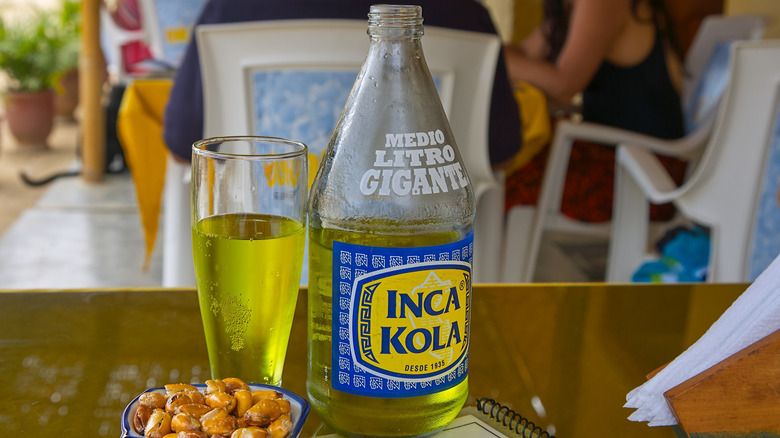 The base of Inca Kola's flavor is lemon verbena, a green leaf that has a surprisingly lemony smell and flavor. Although the flavor of this yellow, fizzy beverage isn't super citrusy — some liken the taste of Inca Kola more to bubblegum or cream soda.