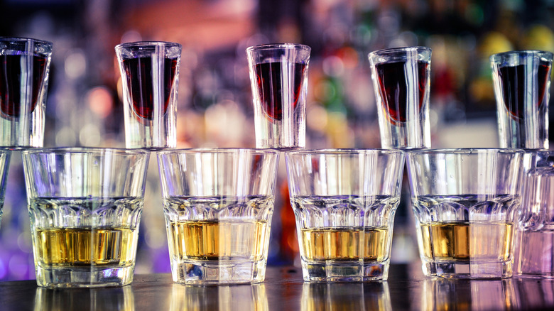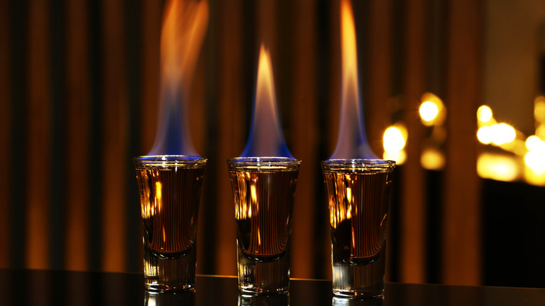 The standard recipe includes a shot glass filled with amaretto, topped with a float of high-proof rum (usually Bacardi 151). The shot is then carefully lit on fire and dropped into a half pint of beer. Once the flaming shot hits the beer, the fire extinguishes, and then you down it. It's very important to do these steps in order, as drinking a still-flaming shot could lead to singed eyebrows ... or worse. Be sure to bone up on how to drink flaming shots without endangering the whole bar before ordering.
