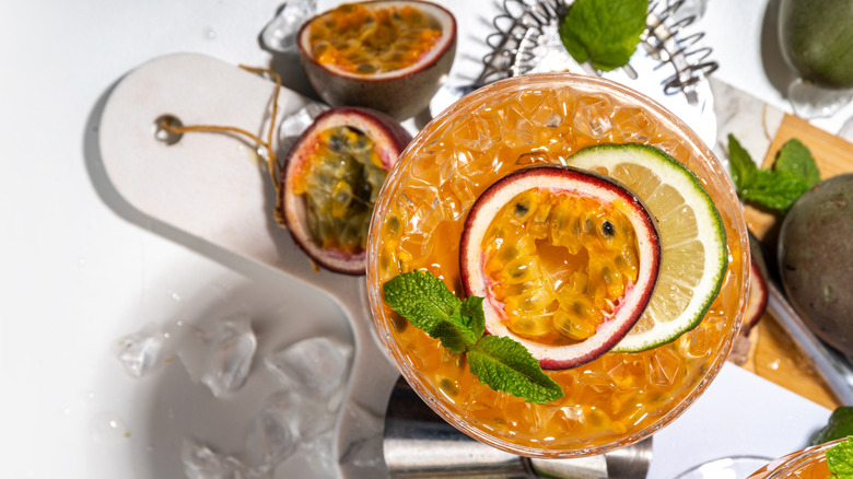 The classic Porn Star Martini recipe combines vanilla vodka, passion fruit puree, lime juice, and vanilla syrup, shaken and strained into a coupe. It's served with a halved passion fruit floating on top and a chilled shot of prosecco on the side. You can sip the bubbles or pour it directly into the drink. The drink became a UK nightclub staple throughout the 2000s and has found renewed fame on TikTok and in cocktail bars leaning into cheeky nostalgia. As of this publication, bartenders often upgrade the drink with real vanilla bean, fresh passion fruit, or even swap the prosecco for Champagne (if you're feeling fancy).