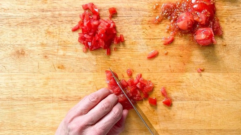 - Remove the stems ends and seeds from the remaining 2 tomatoes and finely chop.