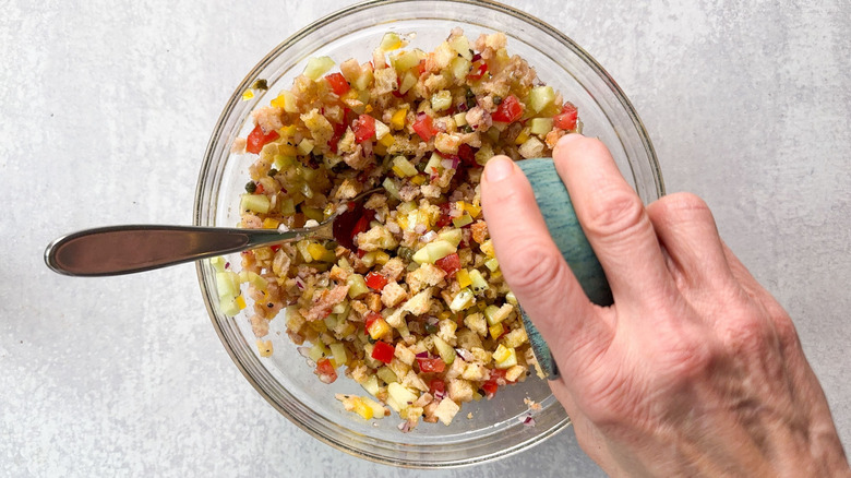 Add the chopped tomatoes, cucumber, onion, bell pepper, capers, and garlic to the bowl with the bread and toss.