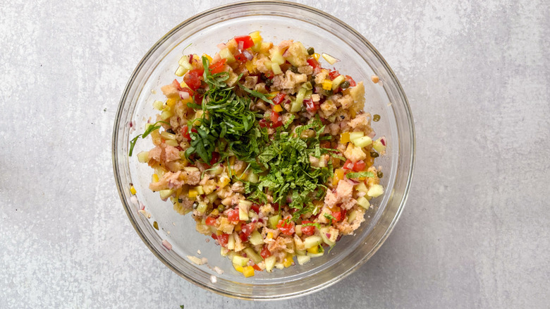 - Add the chopped tomatoes, cucumber, onion, bell pepper, capers, and garlic to the bowl with the bread and toss.
