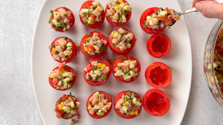 This summery recipe starts with flavorful Campari tomatoes. Look for tomatoes that are ripe but not overly soft, as they will be more difficult to trim and hold their shape. Choose tomatoes that are uniform in size for the best presentation and even distribution of stuffing.