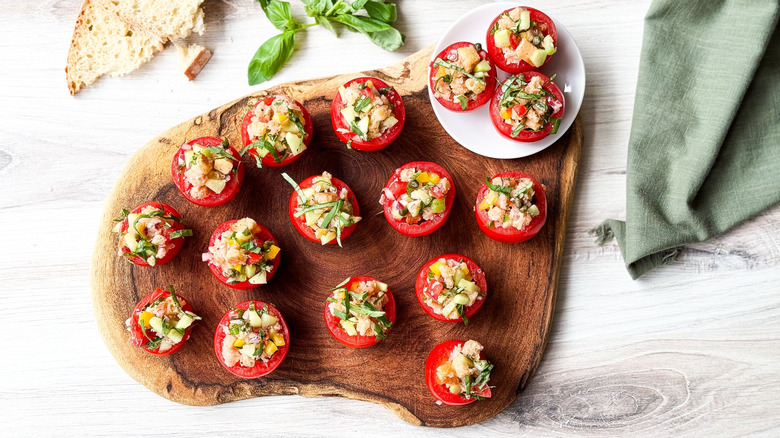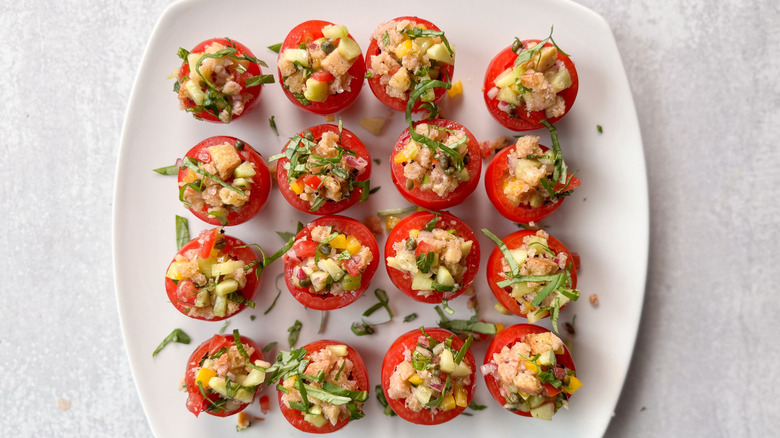 If you haven't tried panzanella before, it is much more delicious than the ingredients might make it sound. Stale bread soaked in vinaigrette and tomato juices, along with some crunch from fresh vegetables and herbs may sound like an unusual salad, but it makes complete sense once it hits your tastebuds. Panzanella is a very old and classic Italian preparation that is most delicious in the summer months when tomatoes are at their peak of ripeness. Recipe developer Julie Kinnaird gives this classic a twist with her bite-sized panzanella stuffed tomatoes. Flavorful Campari tomatoes serve as the vessels for a panzanella made with cucumber, bell pepper, red onion, and capers. Ciabatta bread makes up the base of the salad, which is given a boost of brightness with fresh basil and mint.