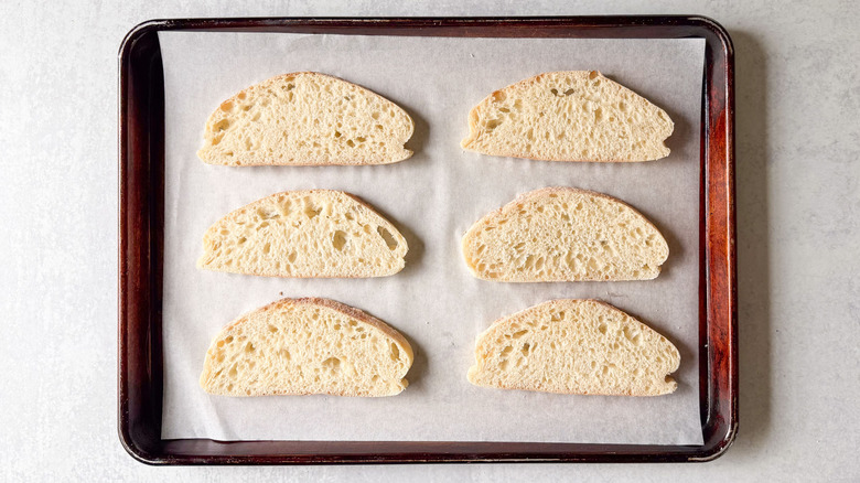 Line a baking sheet with parchment paper and arrange the bread slices in an even layer.