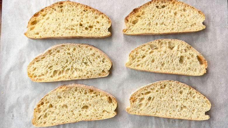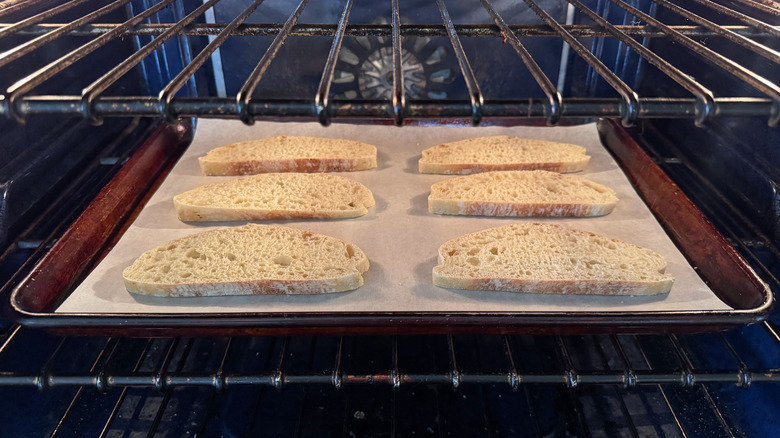 - Line a baking sheet with parchment paper and arrange the bread slices in an even layer.