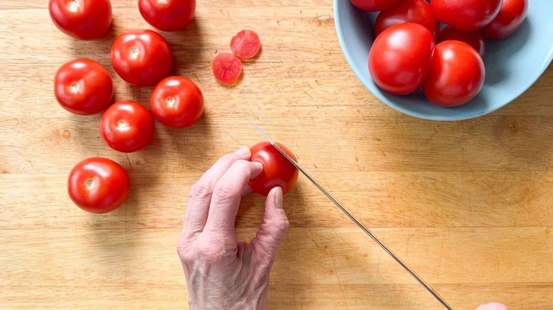 - Turn the tomatoes over and cut about ¼-inch from the top of each.