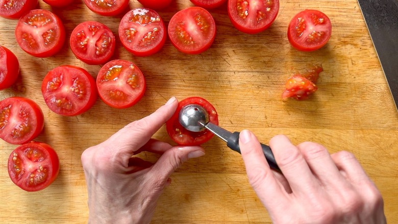 - Scoop out the tomato seeds with a melon baller or small spoon.