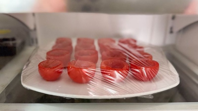 - Place the prepared tomatoes on a plate, cover with plastic, and refrigerate until ready to fill.