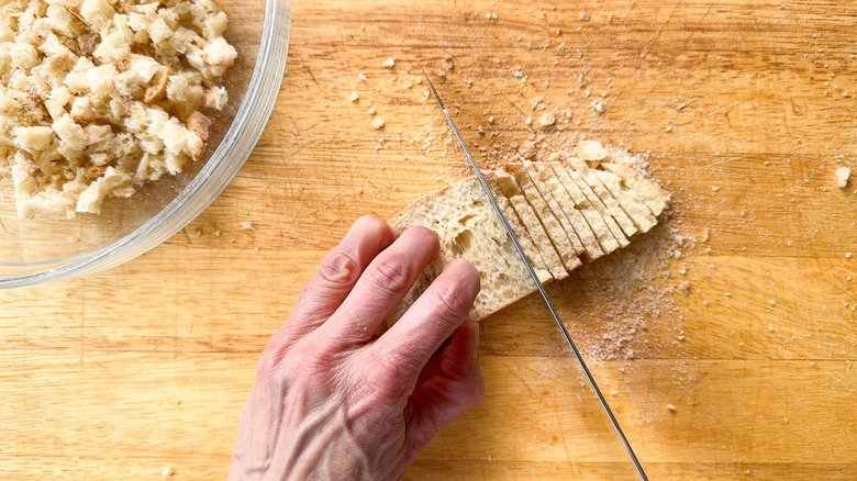 - Once the bread is cool, cut it into tiny pieces and place in a medium bowl.