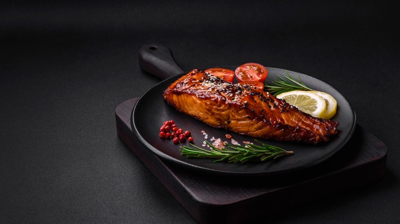If you're more of a fish lover, then serving up your plate of fish and chips with black garlic ketchup might be all the flavor you need to reinvent a classic. However, you can also go beyond that. Black garlic ketchup is extremely umami, which is a great combination for beer-battered fish. You could even branch out to other types of fish, such as salmon, and brush them with the ketchup. Salmon and black garlic are a particularly great pair as they're both umami-based, and salmon's smoothness when cooked will absorb the rich flavors of the ketchup. Black garlic ketchup is a worthy addition in your glaze that doesn't overpower, but which adds a welcomed dose of fermented flavor and rich color.