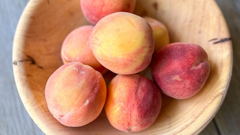 Whichever variety of peach you choose from the market, make sure that you are getting the sweetest ones available. Good indicators of a ripe, juicy peach include a deep and vibrant hue of gold or blush pink, free of any green undertones. A wrinkle around the stem also means that the peach was fully ripe when picked and has lost a bit of moisture, which concentrates the sugars and contributes to peak sweetness. It's also a good idea to give your peaches a smell. Ripe peaches will have a strong and sweet aroma, whereas underripe peaches will have little to no smell and subsequently a lower sugar content.