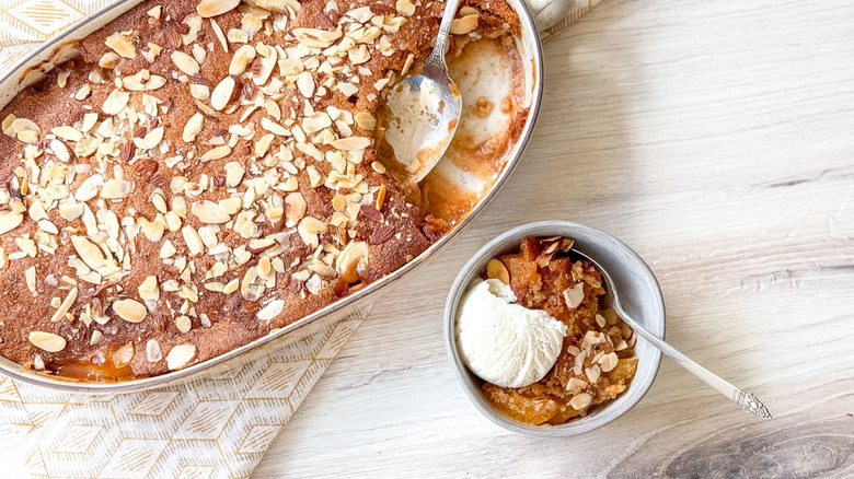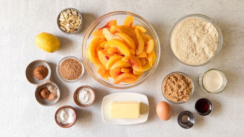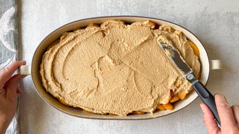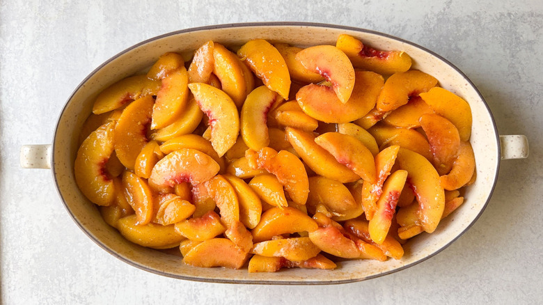 If you find yourself with a glut of ripe peaches, you can certainly use them in this recipe. As a general rule, Kinnaird says that 4 medium peaches equal roughly 1 pound. If in doubt, just measure out 6 cups of sliced fresh peaches, or use a kitchen scale to weigh out the slices. When choosing fresh peaches to use, you may see the names "clingstone" or "freestone" associated with peach varieties. These literal descriptions refer to whether the pits are attached to the peach flesh or free. Freestones are generally easier to cut, slice, and eat, making them a good choice for this recipe. That said, because the peaches will break down during the baking process, the type of peach you use is not all that important, so you can use what you have on hand.