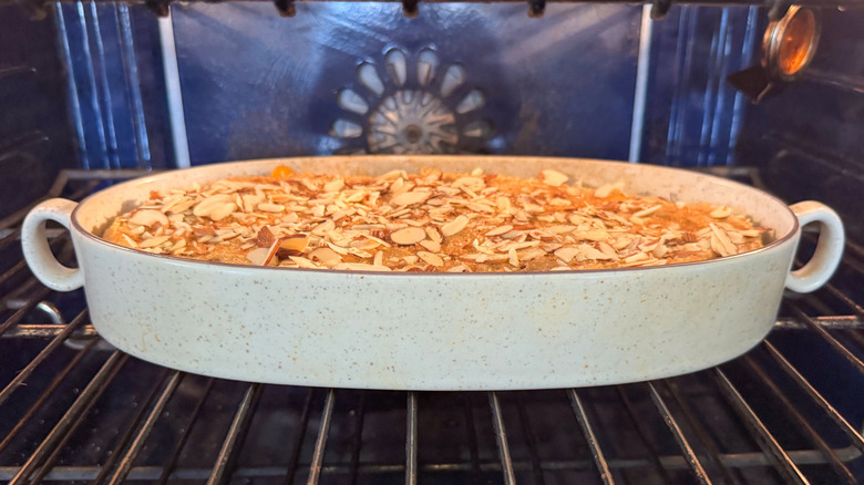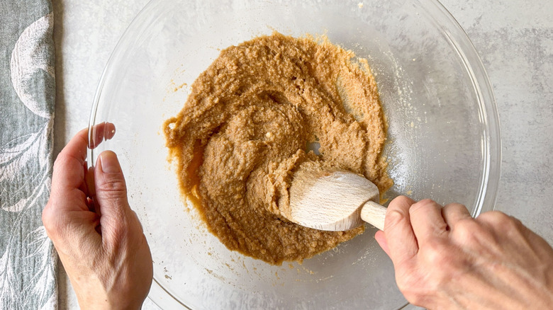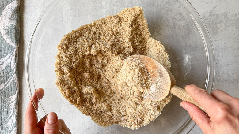 - In a separate large bowl, stir together the almond flour, brown sugar, baking powder, salt, cinnamon, nutmeg, and cardamom.