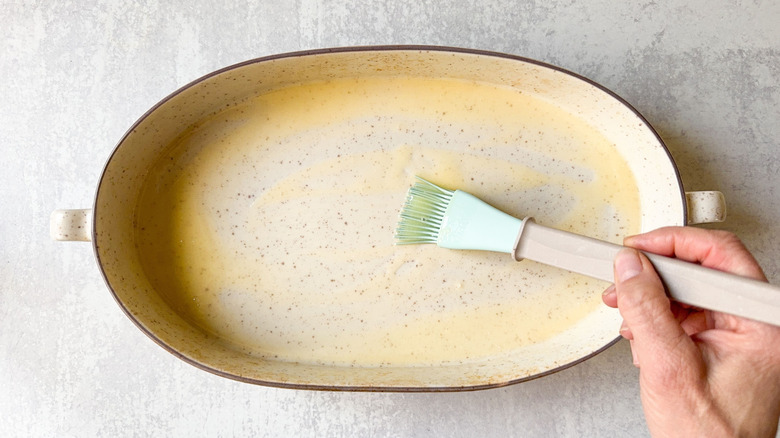 - Brush the inside of a 2-quart casserole or baking pan with the melted butter.