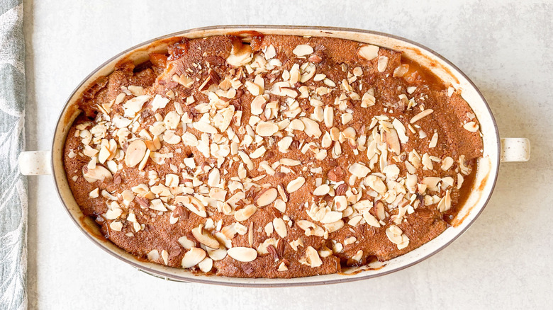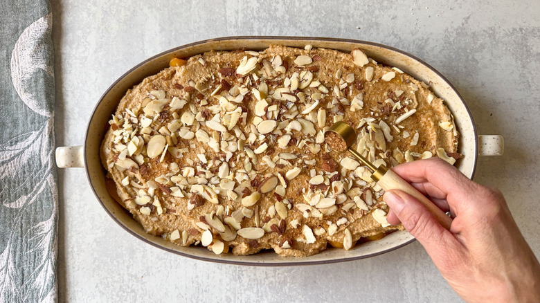 Kinnaird uses blanched almond flour in the cobbler dough, which not only makes this recipe gluten-free but also gives it a nice texture and nutty flavor. The texture of the topping is as tender and crumbly as that made with regular flour, so this recipe will appeal to everyone, whether or not they're searching out gluten-free dishes. The cobbler is flavored with cinnamon, nutmeg, and cardamom, and lemon zest gives a bit of brightness. Brown sugar sweetens the dessert and adds a nice hint of caramel. Slivered almonds and a sprinkle of turbinado sugar give this cobbler topping an additional crunch.