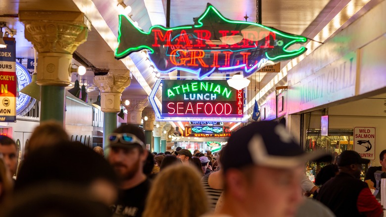 Food halls act as community builders, using engaging social spaces and local vendors to bring people together, whether it's residents or tourists. Pike Place Market, being a more developed food hall (opened 1907), hosts an eclectic blend of vendors from tasty casual meals to hidden gems only seen at local markets. Although it's home to the world's first Starbucks, major chains end there. Instead, diverse eateries like Pike Place Chowder and Pasta Casalinga offer high-quality cuisine. Farmers selling fresh organic produce and butchers offering prime cuts of meat line the market's main corridor. Local artisans and shop owners add charm to the area, offering everything from household goods to custom art pieces. In support of residents, programs such as Fresh Bucks lower the cost of fruits and vegetables. Communal seating can be found on the outskirts of the market, where patrons get a view of the Puget Sound.