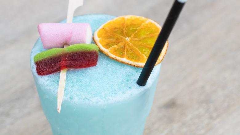 Sour candies make your mouth pucker by way of citric, malic, and tartaric acids — the same compounds found in fruits. All the while, acidic elements are another building block of mixed drinks right up there with sugar. This makes the sweet's zingy palate complement the drinking experience twofold. Not to mention, sour candy-garnished cocktails grab your attention. A cheerful tone is set just glancing at a mixed drink topped with technicolored sweets. Further with a cocktail build that mirrors the garnish, and it's truly a transformative experience. Whether you're reaching for sour gummy worms, lemon drops, or a box of Sour Patch Kids, dive into the many boozy ways of melding childhood delights with adult fun. With enough finesse, these additions amplify the drinking experience and add a humorous touch all the while.
