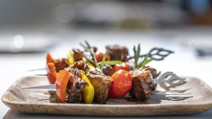 When crafting a meaty kebab, a leg of lamb rewards with several ideal qualities. The cut contains fat — you should notice some visible white streaks — which lends moisture and flavor, but trim away some of the compound in order to avoid an off-putting texture. The fat also heavily contributes to lamb's distinct palate, so throw out excess to remove the gamey flavor of lamb (but leave a measured amount so you don't need to worry about dry, bland meat).