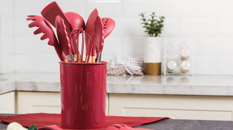 You can keep things elegant and elevated with a wood or ivory-toned ceramic holder, or bring in the color with a patterned option, such as this LEAZUL funky floral holder. If you go this route, remember to clean the utensil holders regularly. It's one of those areas of the kitchen most people forget to sanitize, but over time, bacteria and even food splatters can make their way into that container. Simply wash it with soap and water to remove any built-up bacteria.