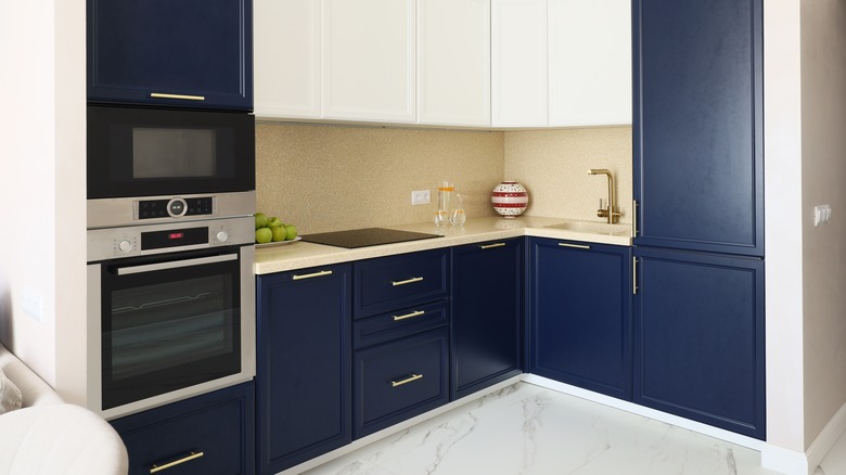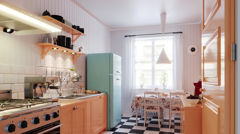 If you're painting a tiny kitchen, make sure to stick to one color or two at the most. That way, you don't clutter everything up, which can make you feel like you're cooking in a kaleidoscope.