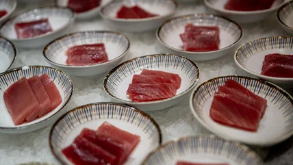 There are different ways to gauge if the tuna is worth buying aside from the price tag, but it's important to know how you're consuming it first. If you plan on eating it raw, check if it's high in fat. Similar to the marbling in steak — an indicator of how juicy it can be — a good piece of tuna should also have a gorgeous display of it just under the skin. It should also have a sticky, glossy appearance that comes in a red hue. It's important to note, though, that some people use carbon monoxide treatments on tuna to maintain its bright color — even when it's no longer fresh, the color stays the same.