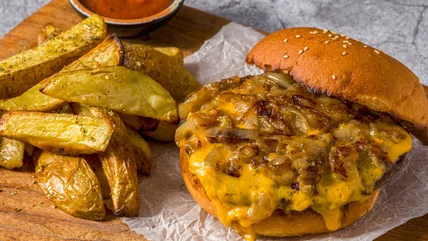 The beauty of a smash burger is that, when the meat is compressed into a disk, there's far more room for toppings. However, with this flavorful burger concept, you don't need many of them: Sautéed mushrooms boost the burger's umami and add a pleasant textural element; a garlic aioli or mayonnaise is the only sauce you need; and lightly caramelized onions give the burger a nice crunch and boost the onion flavor. For an onion topping, go with yellow or sweet onion instead of red or white; these would be overbearing on this burger. With the power of French onion soup and a few simple toppings, boring smash burgers are a thing of the past.