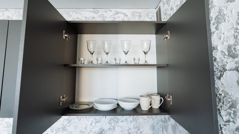 The goal is to be able to see everything you own by opening a door. "It's okay to stack items like matching drinking glasses two or three rows deep, but don't mix types," Lang advises. For instance, you don't want to put a glass behind a coffee mug or wine glass, because you'll forget they're back there. You can solve this issue with organizing tools: water bottle racks, lazy susans, or risers.