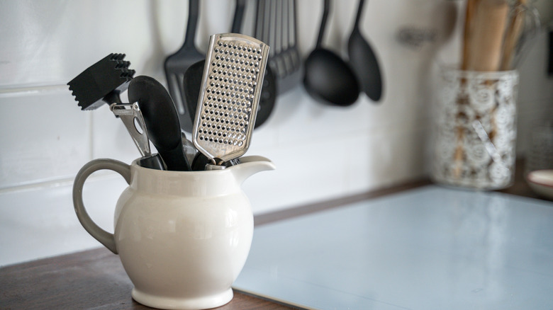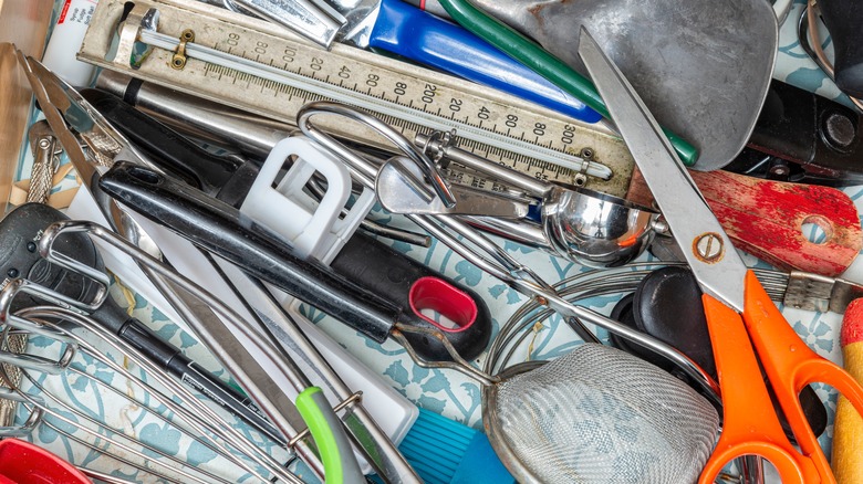 Teaspoons and measuring cups should be in the same place. Knives and cutting boards should live next door. And utensils should always go in a big, conveniently placed drawer or crock. Consider an affordable option such as the DOWAN Extra Large Utensil Holder, or get one at the thrift store for pennies on the dollar.