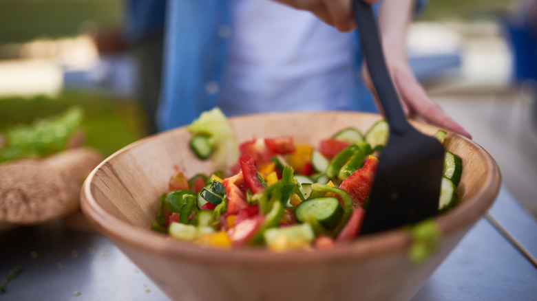 How much salad you'll need depends on a variety of factors — the kind of party you're hosting, the other dishes you're serving, and your guests' dietary preferences, among others. For help puzzling it out, Chowhound turned to expert home entertainer Jessie-Sierra Ross, author of the cookbook "Seasons Around the Table; Effortless Entertaining with Floral Tablescapes & Seasonal Recipes." For a general rule of thumb, Ross says, " ... most people will be satisfied with about one cup of soup and one cup of salad per guest for a plated meal." This is equal to roughly 4-5 ounces of salad for each guest. Since you're likely making one large salad before portioning it out, Ross advises, "Simply calculate the number of guests multiplied by the number of ounces to get your amounts."
