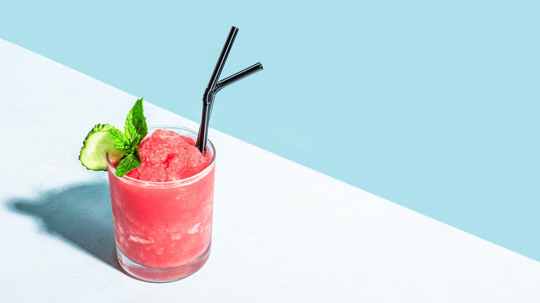 One of the best things about cucumber vodka slushies is how flexible they are. Once you've nailed the basic lemon or lime and cucumber version, it's easy to mix things up with just a few swaps. For starters, try mixing in another vodka flavor. If cucumber isn't your thing, go for something sweeter like strawberry, watermelon, or even peach. Just keep in mind that not all flavors work with citrus, so you'll want to switch up the base of your slushy too. Think other fruit-forward slushies to mix and match with flavored vodka; this hack doesn't have to be limited to just lemon or lime slushies. Another fun hack if you're in no rush is to infuse fruits into your vodka — it's a cheap trick to level up mediocre vodka as well. You can also try add-ins to boost the flavor and make your drink even more refreshing. Fresh herbs like mint or basil go great with cucumber or citrus.